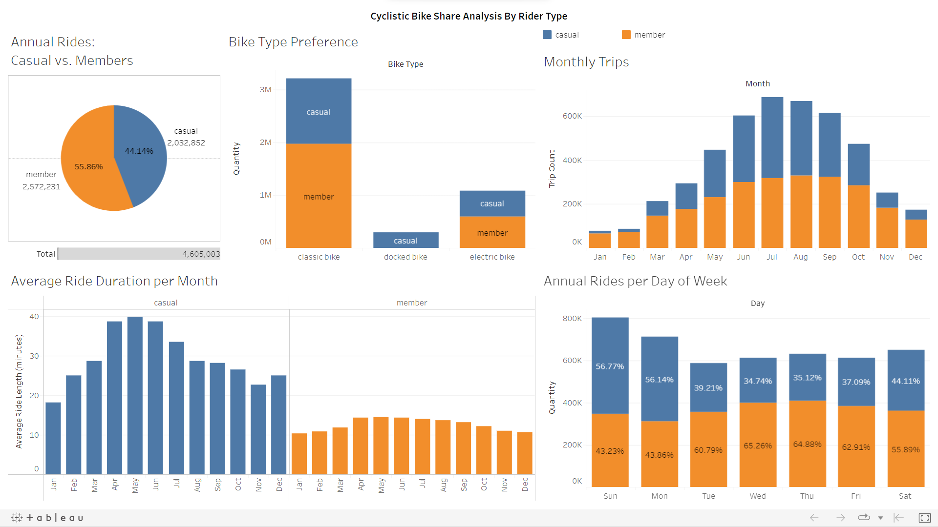 I conducted an analysis to understand the differences in Cyclistic bike usage between annual members and casual riders. The insights include the count of annual rides by rider type, frequency of usage by month, and Bike type preference by rider type. Stakeholders can refer to an interactive Tableau dashboard for more details, and all the analysis SQL code is available for reference.